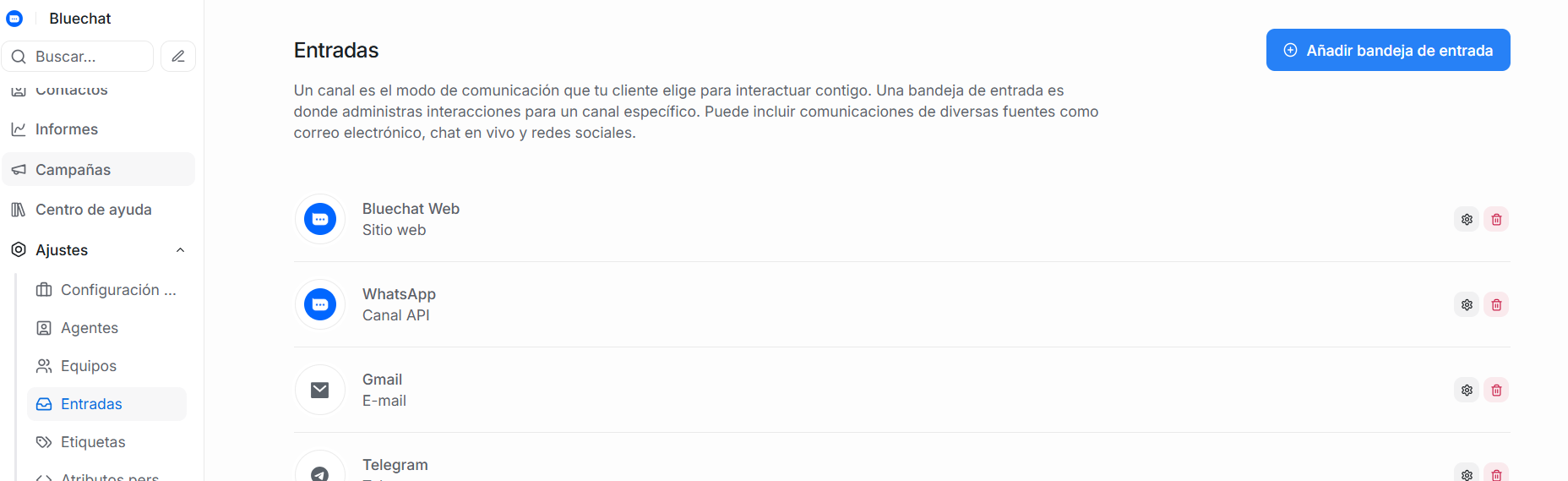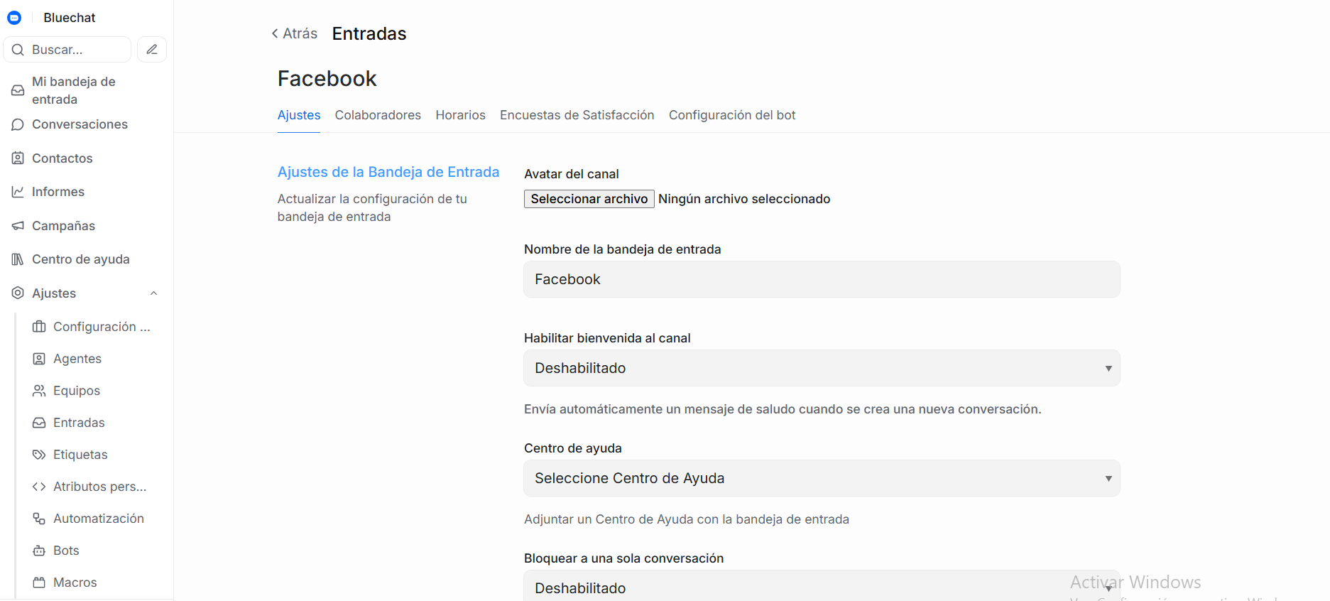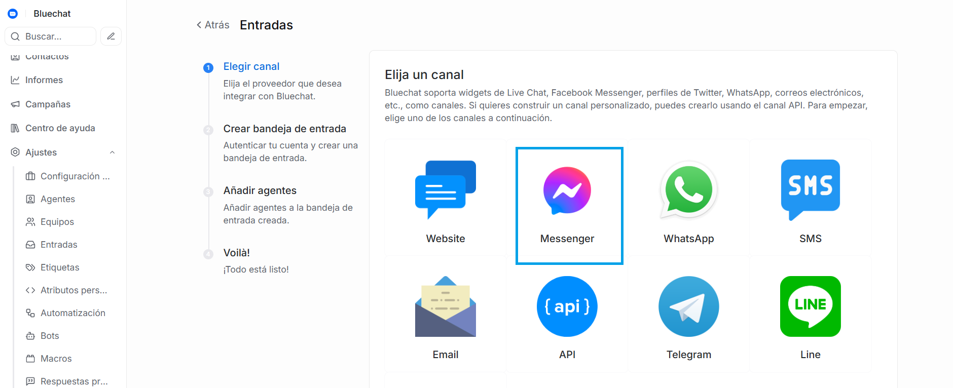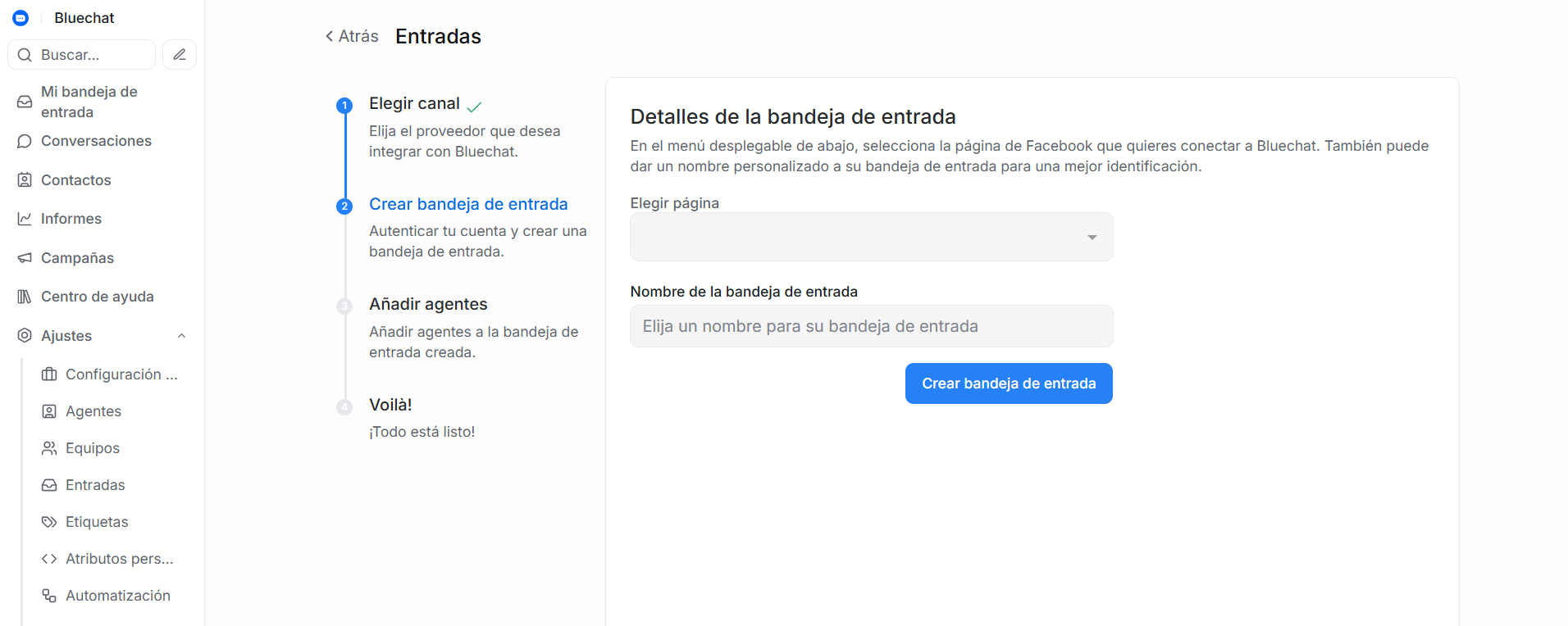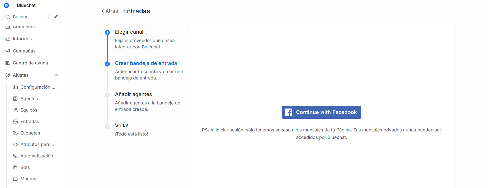 ¡Listo! Has creado exitosamente una bandeja de entrada de Facebook. Cada vez que un cliente envíe un mensaje a tu página de Facebook, podrás verlo y responder desde Bluechat.