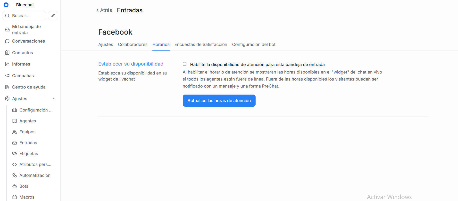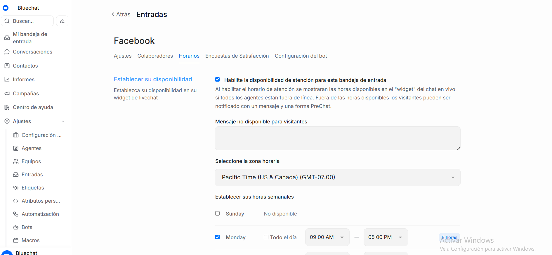 Desde esta sección puedes configurar el horario laboral del equipo asignado a la bandeja de entrada de Facebook.